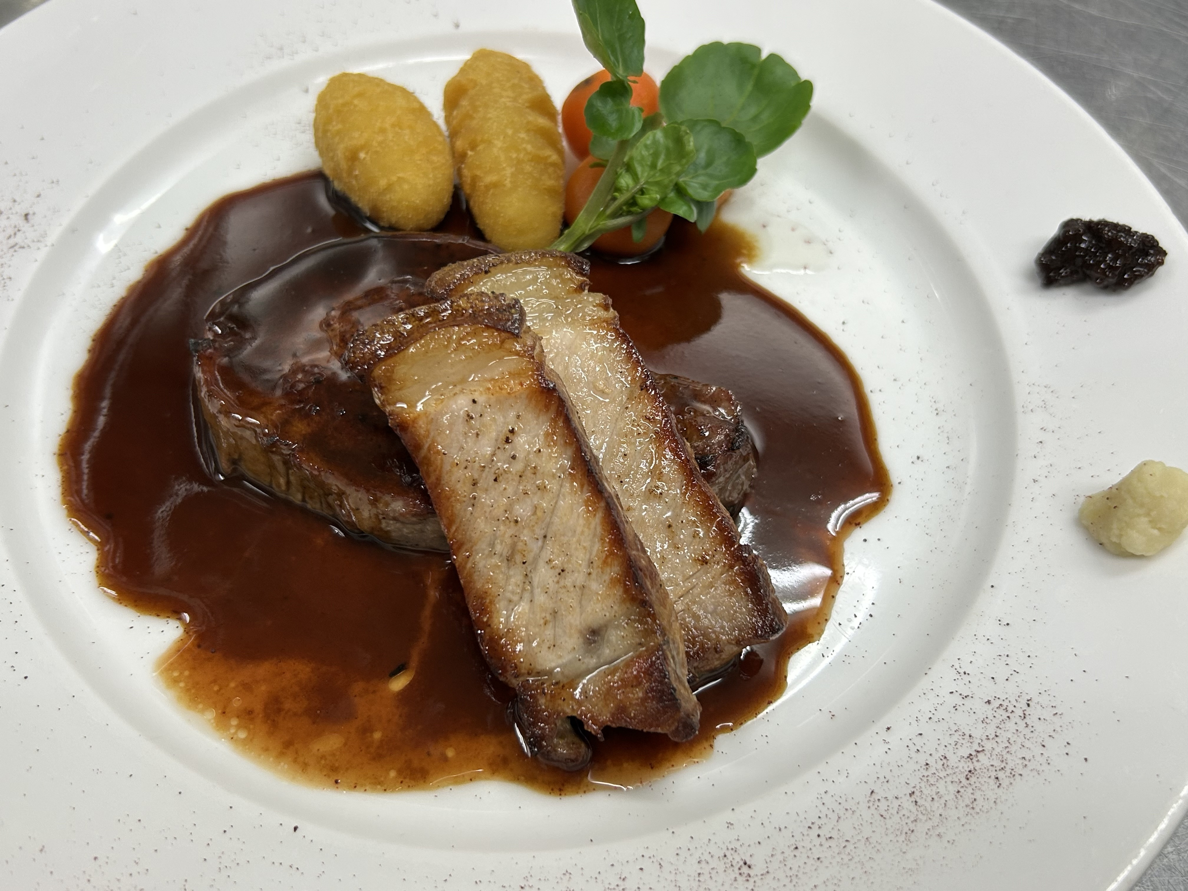 メインディッシュ:牛フィレ肉のオーブン焼きと桃色吐息豚のスモークソテー~ソースポルト