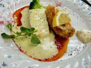 魚料理:鯛のポワレと甘鯛の鱗付きフライ~バジルクリームソース